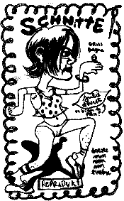 Manche werden das abtun , als sei C = D(ME,Phlopsy,K) eine sortierte Schwierigkeit , also einfacher als am Anfang , also Lüge. Wodrum gehts ? Diese Kurve in P bewegt sich längs einer radikalen Verneinung der Verkennung der Blödheit des Doppelsinns . Also ist das Comic die Begründung der Theorie des Comics als einer Nicht-subjektiven , Nicht-intersubjektiven , Nicht-(rein-texthaften) Echt-Lebensweise innerhalb etwas rein-texthaften ? Als einer Echt-Körper-Lebensweise , die Texthaftigkeit als eines ihrer Axiome eben körper-lebt ? Figurative Selbstportraits ( = auto-bio-graphische ) , text-körper-artige Wesen bevölkern das Comic = D . Eine Comic-Zeichnerin zeichnet . PHLOPSY
